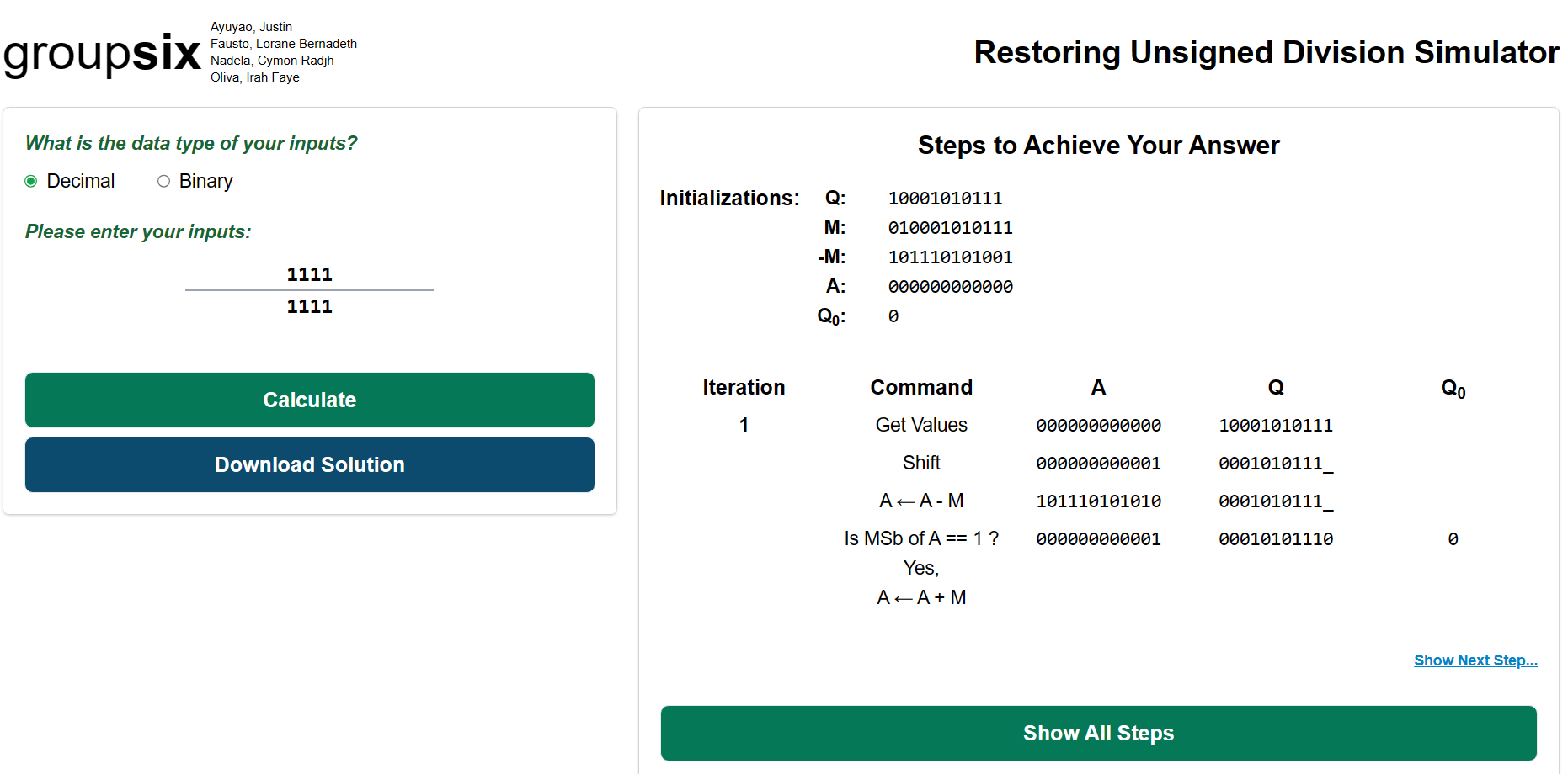 Binary Unsigned Division Calculator